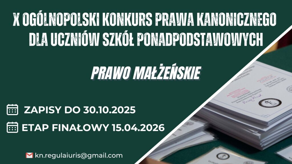 Studencko-Doktoranckie Koło Naukowe Prawa Kanonicznego Regula Iuris działające na Wydziale Prawa Kanonicznego Uniwersytetu Kardynała Stefana Wyszyńskiego w Warszawie ma zaszczyt zaprosić do udziału w X – Jubileuszowej edycji Ogólnopolskiego Konkursu Prawa Kanonicznego dla Uczniów Szkół Ponadpodstawowych.