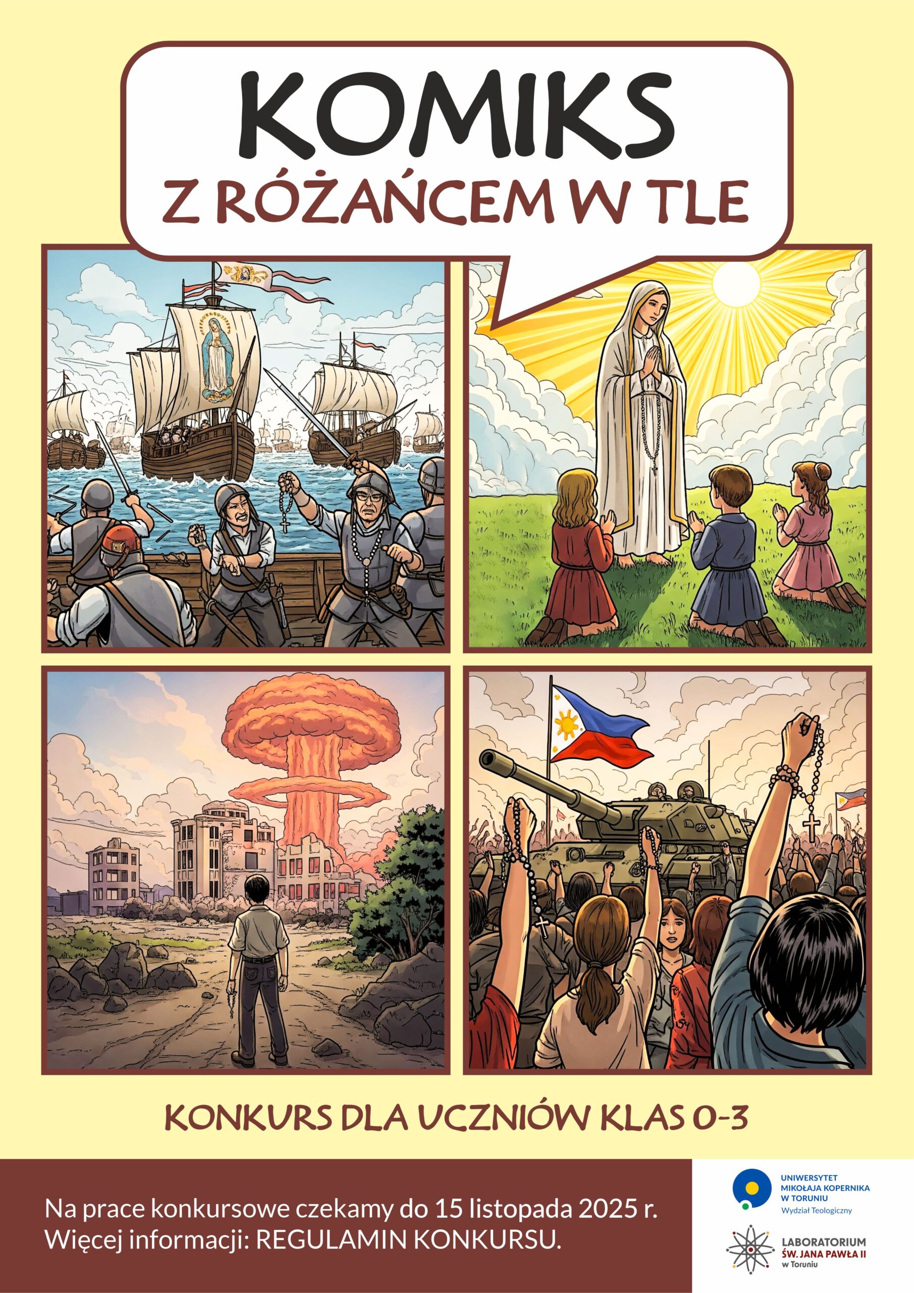 „Laboratorium św. Jana Pawła II” działające na Wydziale Teologicznym Uniwersytetu Mikołaja Kopernika w Toruniu zaprasza do wzięcia udziału w konkursie plastycznym „Komiks z różańcem w tle” adresowanym do uczniów klas 0-3 Szkół Podstawowych. Więcej informacji w Regulaminie na stronie jp2.umk.pl